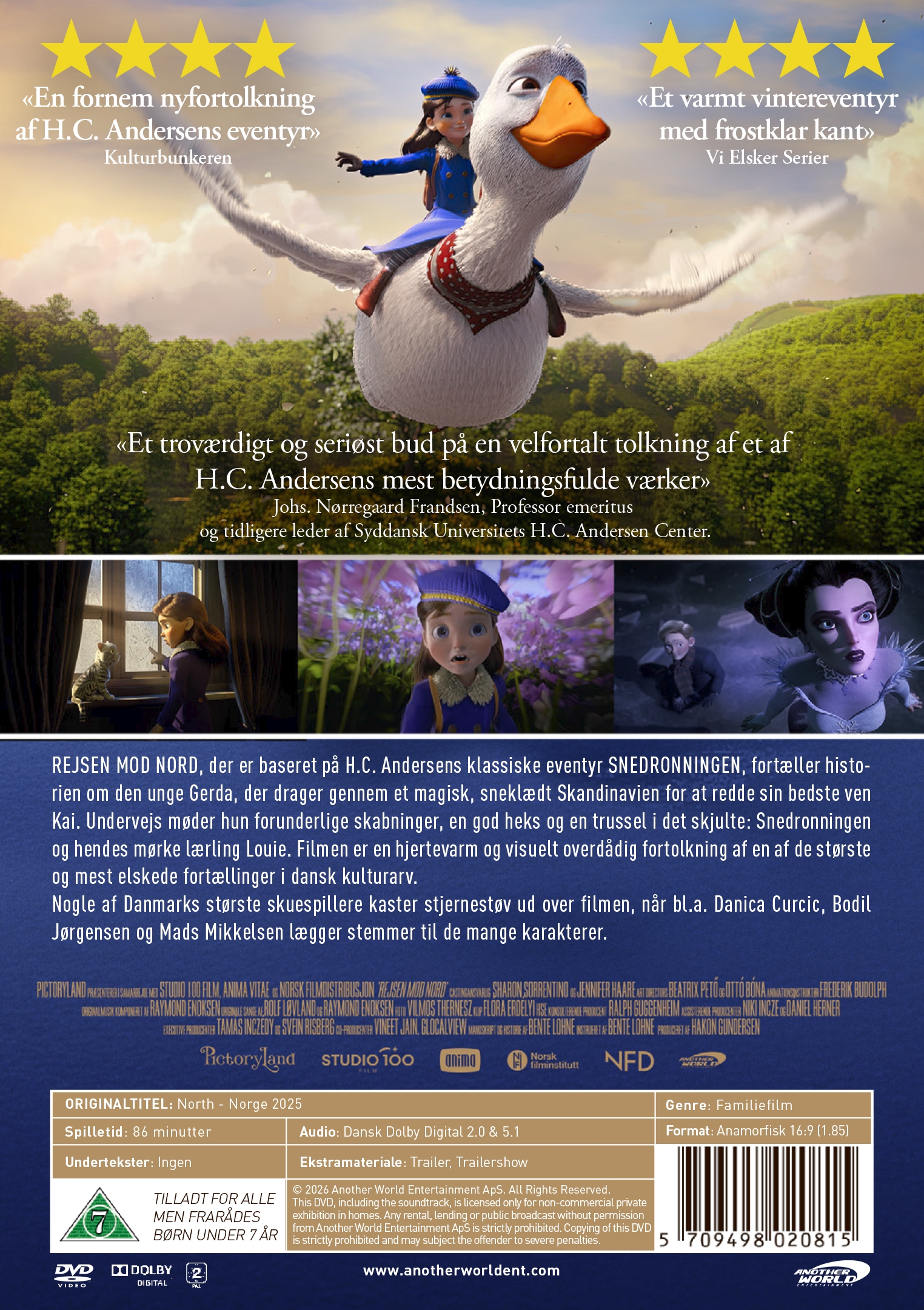 REJSEN MOD NORD, der er baseret på H.C. Andersens klassiske eventyr SNEDRONNINGEN, fortæller historien om den unge Gerda, der drager gennem et magisk, sneklædt Skandinavien for at redde sin bedste ven Kai. Undervejs møder hun forunderlige skabninger, en god heks og en trussel i det skjulte: Snedronningen og hendes mørke lærling Louie. Filmen er en hjertevarm og visuelt overdådig fortolkning af en af de største og mest elskede fortællinger i dansk kulturarv.